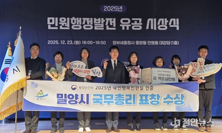 정안뉴스 김재홍 기자 | 밀양시는 23일 정부세종청사에서 열린 ‘2025년 민원행정발전 유공 시상식’에서 국민행복민원실 우수기관으로 선정돼 국무총리 표창을 수상했다.