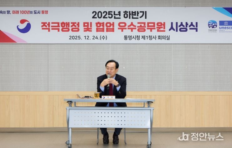 정안뉴스 김재홍 기자 | 통영시는 24일 제1청사 회의실에서 2025년 하반기 적극행정 및 협업 우수공무원 시상식을 개최하고,적극적인 문제 해결과 부서 간 협업을 통해 우수한 성과를 창출한 공무원과 부서를 시상했다.