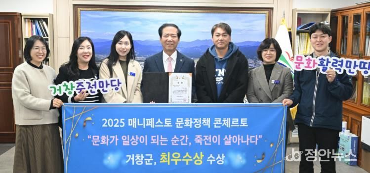 정안뉴스 김재홍 기자 | 거창군은 강원특별자치도 원주시 상지대학교에서 개최한 ‘2025 전국 기초단체장 매니페스토 문화정책 콘체르토(Concerto)’ 대회에서 문화기반 도시활력분야 ‘최우수상’을 수상했다고 26일 밝혔다.