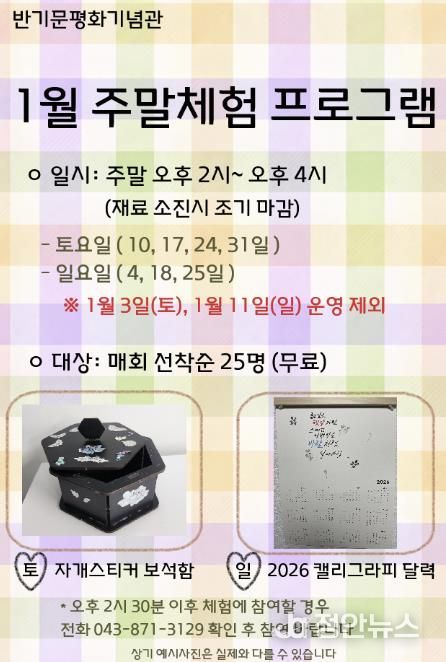 정안뉴스 황은경 기자 | 음성군 제8대 유엔사무총장 반기문 평화기념관에서는 관람객을 위해 2026년 1월 주말 무료 체험 프로그램을 운영한다.