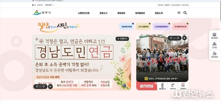 정안뉴스 김재홍 기자 | 밀양시는 지난 26일 오후 시민의 정보 접근성과 이용 편의 향상을 위해 밀양시 대표 누리집(홈페이지)을 부분 개편했다.