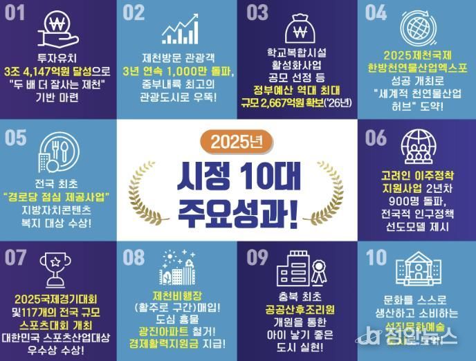 정안뉴스 황은경 기자 | 제천시가 2025년 한 해를 마무리하며 ‘역동적이고 새로운 경제도시 제천’ 실현을 목표로 13만 시민과 1,200여 공직자의 열정과 노력을 바탕으로 거둔 올해의 10대 성과를 선정해 발표했다.