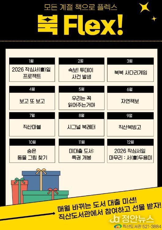 정안뉴스 황도연 기자 | 천안시 직산도서관은 내년부터 월별 독서장려프로그램 ‘북 플렉스(Flex)’를 운영한다고 31일 밝혔다.