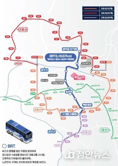 정안뉴스 안정주 기자 | 광주시가 대규모 도시개발로 교통 혼잡이 예상되는 광천권역에 도입하는 ‘백운~매곡 간선급행버스체계(BRT)’ 구축 사업을 올해 본격 추진한다.