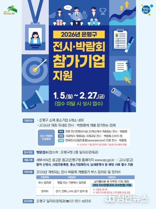 정안뉴스 안정주 기자 | 서울 은평구는 내달 27일까지 ‘2026년 국내외 전시‧박람회 개별 참가 지원사업’에 참여할 기업을 모집한다고 밝혔다.
