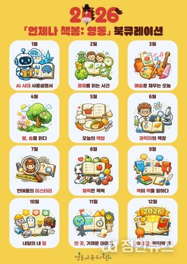 정안뉴스 황은경 기자 | 영동교육도서관은 2026년 1월부터 12월까지 '언제나 책봄: 영동' 북큐레이션을 운영한다. 매월 주제에 맞는 대상별 추천도서 32권을 전시하여 도서관 이용자에게 다양한 독서 경험을 제공하기 위함이다.