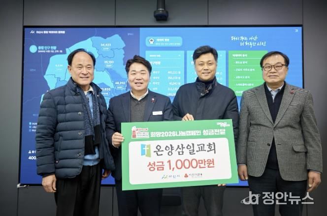 정안뉴스 황도연 기자 | 온양삼일교회가 지역사회를 향한 따뜻한 나눔을 실천했다. 온양삼일교회는 지난 6일 아산시를 방문해 희망2026나눔캠페인 성금 1천만 원을 기탁하여 취약계층을 위해 사용해 달라는 뜻을 전했다.
