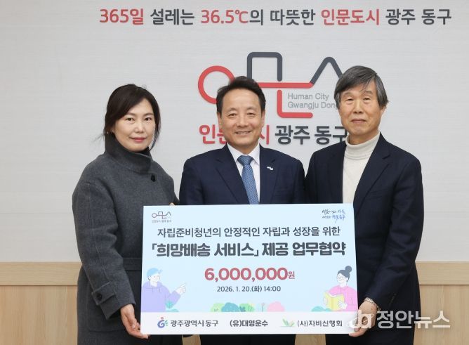 정안뉴스 안정주 기자 | 광주 동구는 지난 20일 (유)대영운수(대표 김정진), (사)자비신행회와 함께 자립 준비청년의 안정적인 사회 정착을 돕기 위한 ‘희망배송 서비스’ 업무협약을 체결했다고 밝혔다.