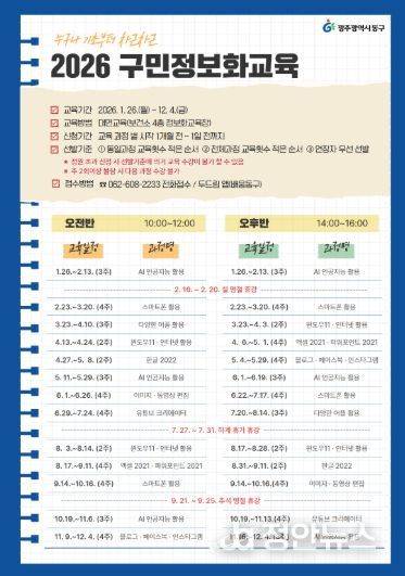 정안뉴스 안정주 기자 | 광주 동구는 생활 속 디지털 활용 능력을 높여 주민들의 삶의 질을 향상시키기 위해 주민 맞춤형 정보화 교육인 ‘구민 정보화 교실’을 이달 26일부터 연중 운영한다고 밝혔다.