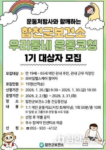 정안뉴스 김재홍 기자 | 합천군은 개인별 체력과 건강 상태를 고려한 맞춤형 운동 프로그램 '우리 동네 운동코칭 : PT with U'에 참여할 1기 대상자를 모집한다고 23일 밝혔다.