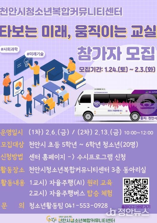 정안뉴스 황도연 기자 | (재)천안시청소년재단 천안시청소년복합커뮤니티센터가 겨울방학을 맞아 자율주행버스를 직접 타보고 미래 기술을 배우는 ‘타보는 미래, 움직이는 교실’ 참가자를 모집한다고 26일 밝혔다.