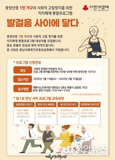 계룡시 관계자는 “이번 프로그램은 중장년층 1인 가구의 사회적 고립을 사전에 예방하고 지역사회와의 연결을 돕기 위한 참여형 복지사업”이라며 “관심 있는 시민들의 적극적인 참여를 바란다”고 말했다.