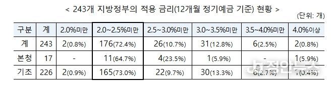 전국 243개 지방정부의 금고 이자율을 조사한 결과, 12개월 이상 정기예금 금리는 전국 평균 2.53%(공개 이자율 기준)로 집계됐다.