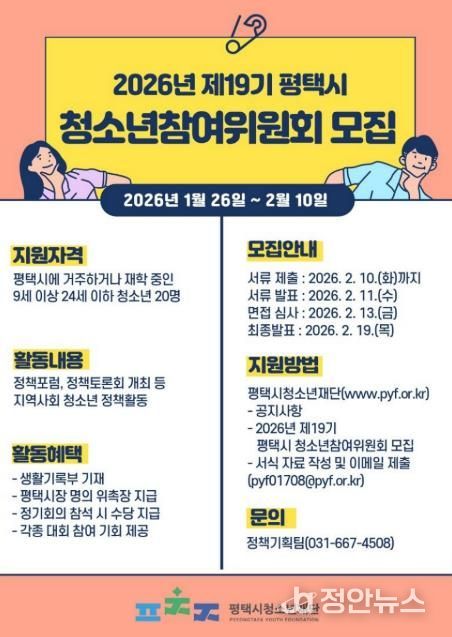정안뉴스 안정주 기자 | 평택시와 평택시청소년재단은 청소년 정책 참여 기회를 확대하고 자치 역량을 강화하기 위한 2026년 제19기 청소년참여위원회 위원 20명을 공개 모집한다고 밝혔다.