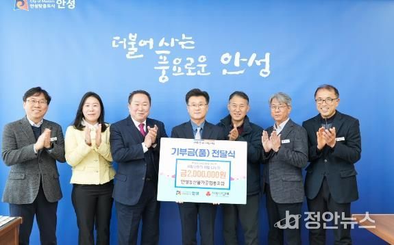 정안뉴스 안정주 기자 | 안성농산물가공협동조합은 1월 27일 안성시에 기부금 200만원을 전달했다. 이번 기부는 2025년에 이은 두 번째 기부로 협동조합이 안성시와 지속적인 발전을 응원하며 지역사회에 온기를 전하는 나눔 활동의 일환으로 해석된다.