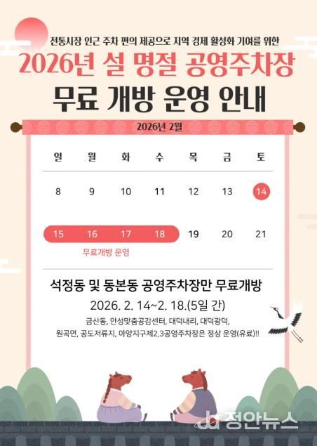 정안뉴스 안정주 기자 | 안성시시설관리공단은 2026년 설 명절을 맞아 2월 14일부터 18일까지 5일간, 공단이 관리하는 공영주차장 중 전통시장 인근에 위치한 석정동 공영주차장과 동본동 공영주차장을 한시적으로 무료 개방한다고 밝혔다.