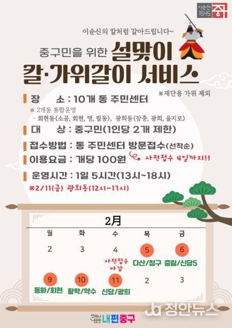 정안뉴스 안정주 기자 | 서울 중구가 설 명절을 앞두고 오는 2월 5일부터 11일까지 동 주민센터를 순회하며 ‘찾아가는 칼·가위갈이 서비스’를 운영한다. 명절 음식 준비로 칼과 가위 사용이 잦아지는 시기에 맞춰, 고향사랑기금으로 마련한 생활밀착형 서비스다.