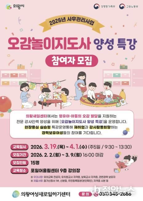 정안뉴스 안정주 기자 | 의왕시 여성새로일하기센터가 '오감놀이지도사 양성 특강'의 교육생을 모집한다.