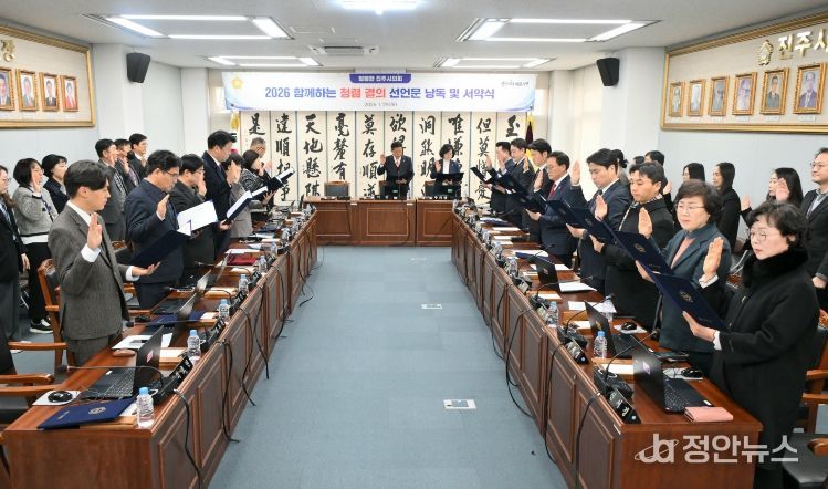 정안뉴스 안정주 기자 | 진주시의회는 29일 제271회 임시회를 앞두고 청렴한 의정 실천을 위한‘2026 함께하는 청렴결의 선언문 낭독 및 서약식’을 개최했다.
