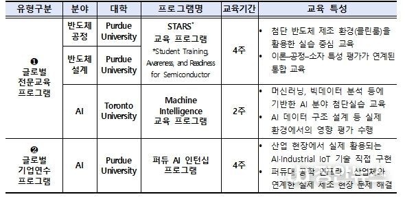 다음으로, ‘첨단분야 글로벌 교육과정 운영사업’은 국내외 대학이 공동으로 반도체, 인공지능(AI) 등 첨단분야와 관련된 해외 교육과정을 기획·운영하는 사업이다. 선발된 학생은 해외 대학에서 실습형 교육과정, 현지 기업 현장 방문, 한인 재직자 간담회 등의 국제 프로그램에 참여하게 된다. 올해는 대학이 추천한 우수 학생 중 120명을 최종 선발하여, 퍼듀대학교(미국), 토론토대학교(캐나다)와 연계해 다양한 교육 경험을 지원할 계획이다.