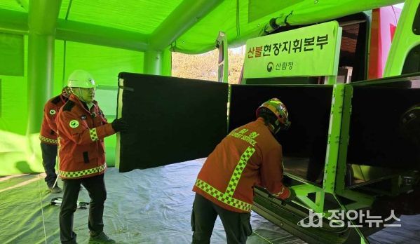이번 훈련은 대형 산불 발생 시 일사불란한 지휘 체계를 확립하기 위한 것으로, 지휘차량 내 시스템 가동 상태를 확인하고 진화 전략 수립 과정을 함께 점검했다.