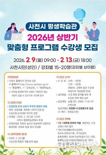 정안뉴스 김재홍 기자 | 사천시 평생학습관이 2026년 상반기 맞춤형 프로그램 수강생을 2월 9일부터 13일까지 모집한다고 3일 밝혔다.