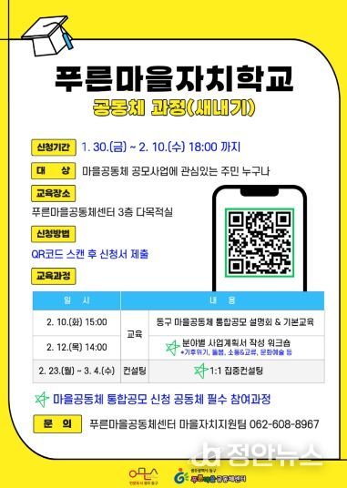 정안뉴스 안정주 기자 | 광주 동구는 마을공동체 활동에 관심 있는 주민을 대상으로 ‘푸른마을자치학교 공동체 과정(새내기)’을 이달 10일부터 오는 3월 4일까지 운영한다고 밝혔다.