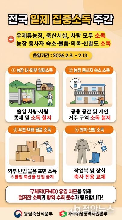 도는 구제역 가축질병 위기 경보를 ‘관심’에서 ‘주의’로 상향했다. 발생 지역과의 역학적 연결 차단을 위해 도내 거점 소독시설 운영을 강화하고, 축산 차량의 소독 필증 휴대 여부를 집중 단속하는 등 차단 방역에 총력을 다하고 있다.