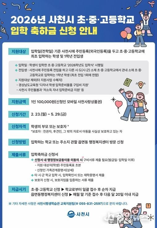 정안뉴스 김재홍 기자 | 사천시는 교육복지 강화를 위해 2026년부터 초·중·고등학교 입학 축하금 지원 대상을 확대해 시행한다고 4일 밝혔다.