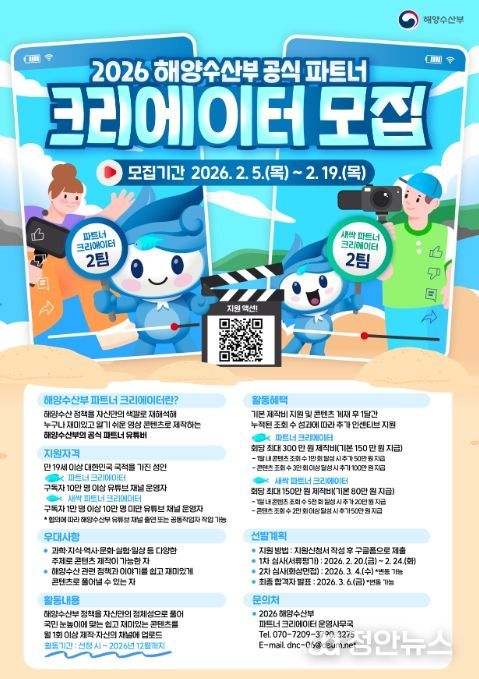 정안뉴스 안정주 기자 | 해양수산부는 2026년 한 해 동안 해양수산 정책을 국민 눈높이에 맞춰 쉽고 재미있게 전달해 줄 ‘2026 해양수산부 공식 영상 협력 제작자’를 2월 5일부터 2월 19일까지 모집한다고 밝혔다.