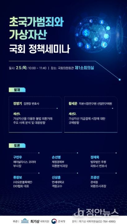정안뉴스 안정주 기자 | 관세청은 최기상 국회의원(더불어민주당·서울 금천구)과 공동으로 2월 5일 국회 의원회관에서 '초국가범죄와 가상자산: 국경을 넘어선 불법 자금 흐름 대응' 국회 정책 세미나를 개최했다.