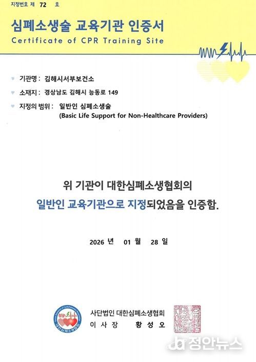 정안뉴스 김재홍 기자 | 김해시는 김해시서부보건소가 대한심폐소생협회(KACPR)로부터 ‘일반인 심폐소생술 교육기관(TS)’으로 공식 지정됐다고 6일 밝혔다.
