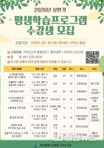 정안뉴스 황정혜 기자 | 부산광역시립구덕도서관은 3월부터 5월까지 유아와 성인 140여 명을 대상으로 구덕도서관에서 ‘2026년 상반기 평생학습 프로그램’을 운영한다.