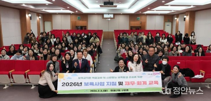 정안뉴스 황정혜 기자 | 연제구는 지난 2월 3일 연제구청 구민홀에서 관내 어린이집 원장 및 보육교사 120여 명을 대상으로 ‘2026년 보육사업 지침 개정사항 및 재무·회계 교육’을 실시했다.