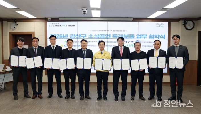 정안뉴스 안정주 기자 | 광주 광산구가 6일 구청 2층 회의실에서 광주신용보증재단, 지역 금융기관 8개소(△광주어룡신협·광주하남신협·우산신협 △광주은행 △하나은행 △농협△서광주새마을금고·한마음새마을금고)와 함께 ‘2026년 광산구 소상공인 특례보증 업무협약’을 체결했다.