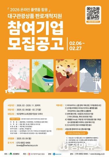 정안뉴스 안정주 기자 | 대구광역시와 대구문화예술진흥원 관광본부는 지역 관광사업체의 경쟁력 강화를 위해 ‘2026년 온라인 플랫폼 활용 대구 관광상품 판로개척 지원사업’을 추진한다.