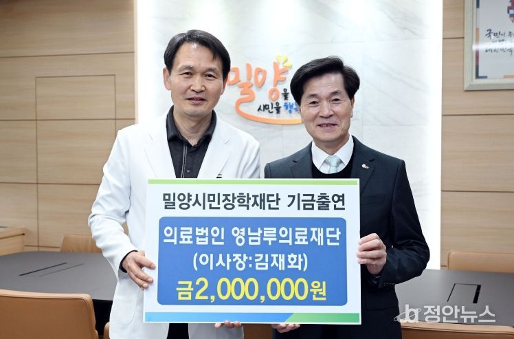 정안뉴스 김재홍 기자 | (재)밀양시민장학재단(이사장 안병구)은 10일 의료법인 영남루의료재단(이사장 김재화)과 대한숙박업중앙회 밀양시지부(지부장 조희선)에서 지역 교육 발전을 위한 장학기금으로 각각 200만원과 300만원을 기탁했다고 밝혔다.