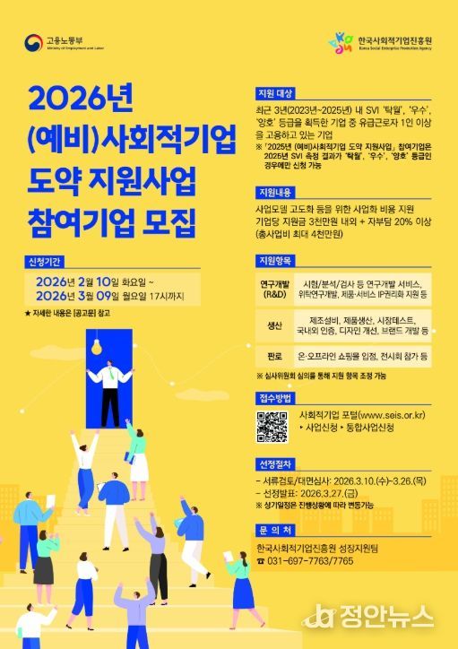 정안뉴스 안정주 기자 | 고용노동부와 한국사회적기업진흥원은 사회적기업의 지속 가능한 성장을 견인하기 위해 성장단계별 체계로 '유망기업 스텝업' 지원사업을 본격 추진한다.