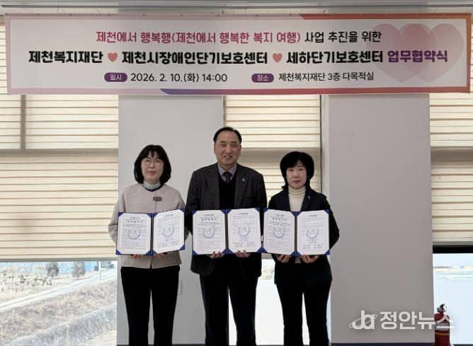 정안뉴스 황은경 기자 | (재)제천복지재단은 제천시장애인단기보호센터, 세하단기보호센터와 함께 장애인의 삶의 질 향상과 지역사회 복지 증진을 위한 '제천에서 행복행' 사업 추진을 목적으로 업무협약을 체결했다고 밝혔다.