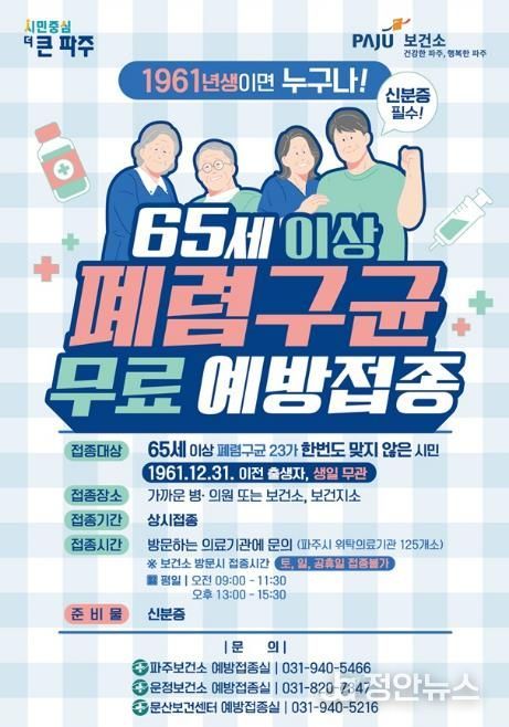 정안뉴스 안정주 기자 | 파주시는 고령층의 건강한 노후와 감염병 예방을 위해 65세 이상 시민을 대상으로 폐렴구균 예방접종을 연중 무료로 지원하고 있다고 밝혔다.