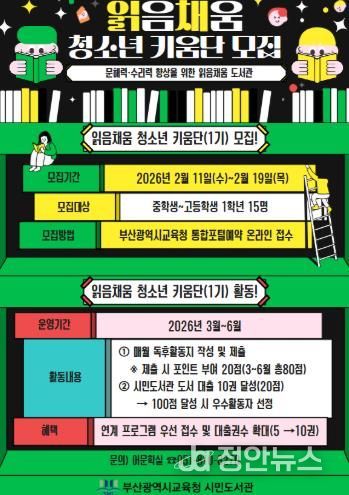 정안뉴스 황정혜 기자 | 부산광역시립시민도서관은 올 한 해 동안 어린이와 청소년의 기초 문해력과 수리력 향상, 자기주도적 독서습관 형성을 지원하기 위해 ‘어린이·청소년 읽음채움 도서관’을 운영한다.