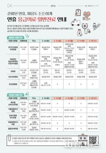 정안뉴스 안정주 기자 | 포천시는 오는 14일부터 18일까지 설 연휴 기간 동안 시민들이 안정적으로 의료서비스를 이용할 수 있도록 응급대응체계를 강화한다.