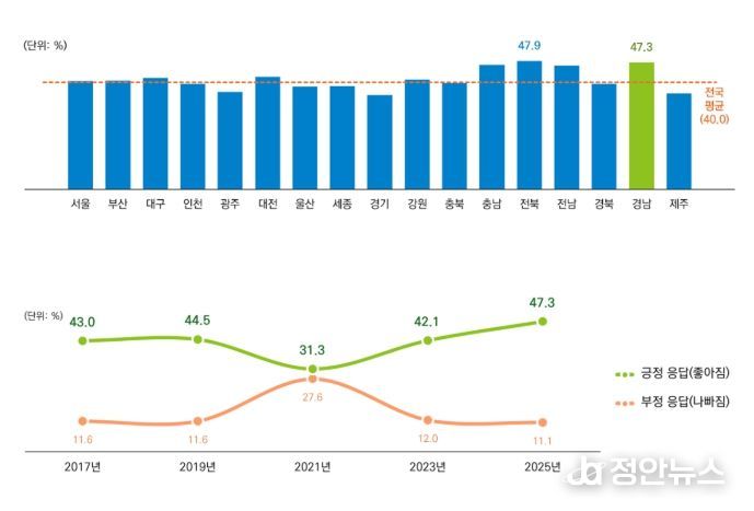 정안뉴스 김재홍 기자 | 경남연구원은 국가데이터처 사회조사 자료를 활용해 경상남도 도민의 생활여건 변화와 정책 체감도를 종합적으로 분석한 ‘경남도민의 삶은 어떻게 달라졌나: 사회조사로 본 경상남도 생활여건 변화’ 이슈리포트를 발간했다.