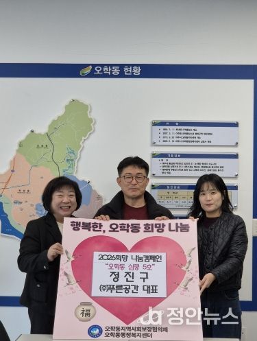 정안뉴스 안정주 기자 | 여주시 오학동은 ㈜푸른공간 정진구 대표가 지난 10일 오학동 행정복지센터를 방문해 이웃돕기 성금 50만 원을 기탁했다고 밝혔다.