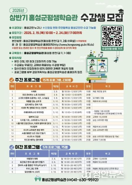 정안뉴스 황도연 기자 | 우수 평생학습도시 홍성군이 유아부터 노년까지 전 생애를 아우르는 학습 기회를 제공하기 위해 오는 19일부터 24일까지 6일간 홍성군평생학습관과 신도시평생학습관에서 상반기 프로그램 수강생을 모집한다.