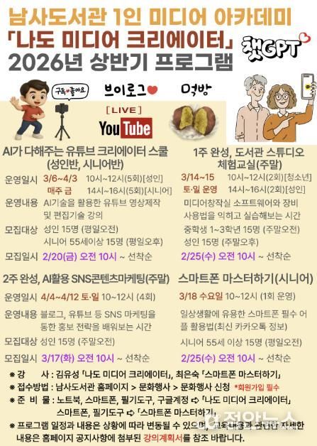 남사도서관 관계자는 “방학과 주말 등 시민이 참여하기 편한 시기에 운영되는 이번 교육으로 누구나 미디어 제작을 경험할 수 있길 바란다”고 말했다.