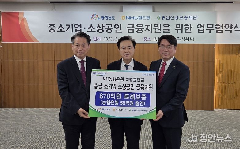 정안뉴스 황도연 기자 | 충남신용보증재단은 충남경제 활력 제고와 지역 중소기업·소상공인의 경영안정 지원을 위해 11일 충남도청에서 충청남도, NH농협은행과 '중소기업·소상공인 금융지원을 위한 특별출연 업무협약'을 체결했다고 밝혔다.
