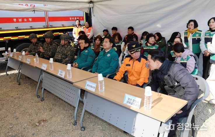 정안뉴스 김재홍 기자 | 양산시는 지난 11일 김해양산대대 주관 혹한기 훈련의 일환으로 황산공원 일원에서 ‘화생방 미사일 피폭에 따른 대량사상자 관리 및 통합피해복구 훈련’을 실시했다고 밝혔다.