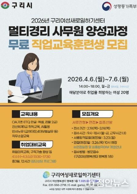 정안뉴스 안정주 기자 | 구리시는 구리여성새로일하기센터에서 취업을 희망하는 여성을 대상으로 운영하는 '멀티경리 사무원 양성과정' 교육생을 오는 2월 19일부터 모집한다고 밝혔다.