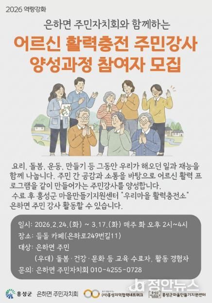 정안뉴스 황도연 기자 | 홍성군 은하면 주민자치회는 홍성군 마을만들기 지원센터와 함께 지역 내 어르신 돌봄과 마을 공동체 활성화를 위해 ‘어르신 활력충전 주민강사 양성과정’ 참여자를 모집한다.